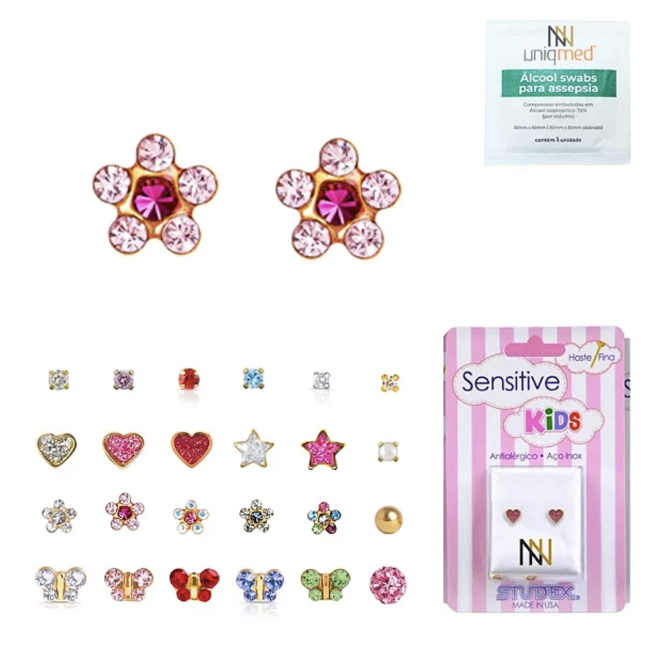 O Brinco STUDEX ser usado por bebês, crianças e adultos no segundo e terceiro furo. Os modelos são delicados além de serem 100% antialérgicos e esterilizados (com data de validade)
